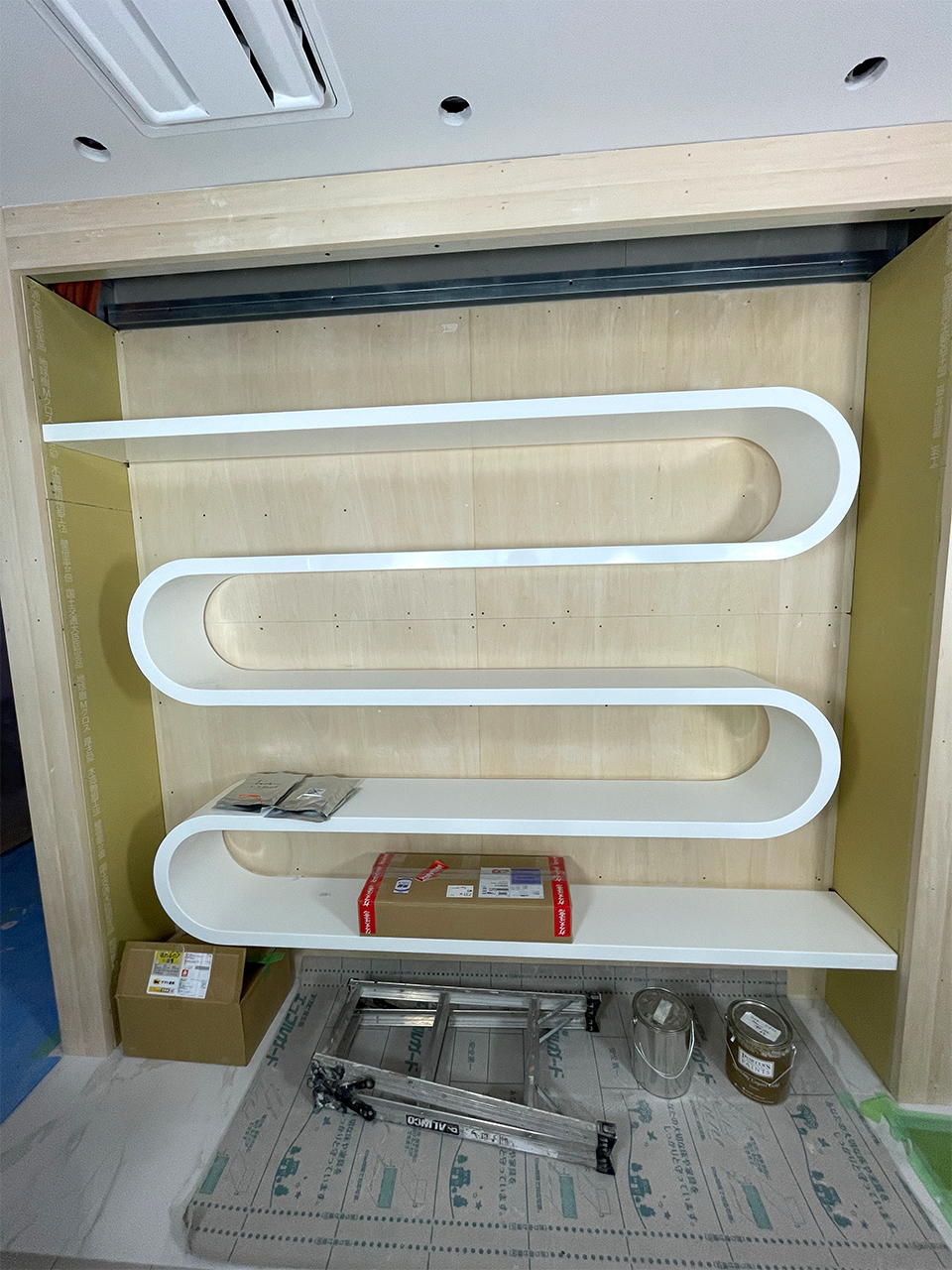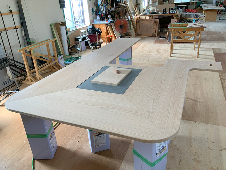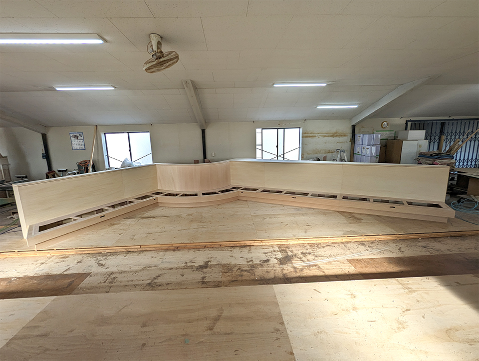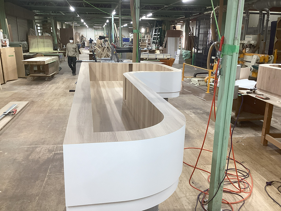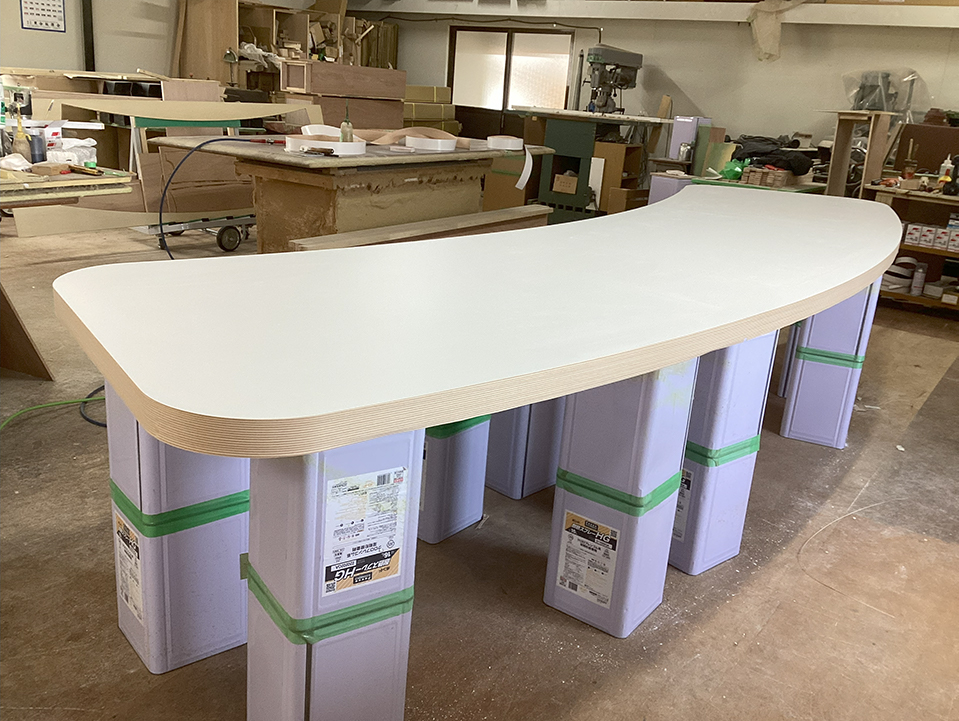 突板Rカウンター天板 変型天板 R植裁什器 変型棚 ラウンド電話台 円形テーブル 円形デスク 台形会議テーブル Rテーブル Rカウンター R壁面棚 トメ加工扉 楕円カウンター 貼り分け 円柱カウンター R引出 隅Rカウンター 多面体什器 多面体ショーケース 多面体スツール 立体扉 多面体カウンター(下地) R衝立