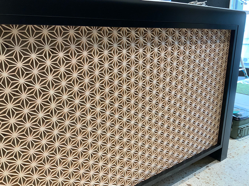 組子 モールテックス施工 ダイノックシート貼り 矢羽根貼り 高透過ガラス 革張り仕上げ 格子金物 和家具金物 NCを用いた加工(地球) NCを用いた加工(歯車) NCを用いた加工(回転オブジェ) シームレス加工(人大) 折り返し加工 布張り仕上げ